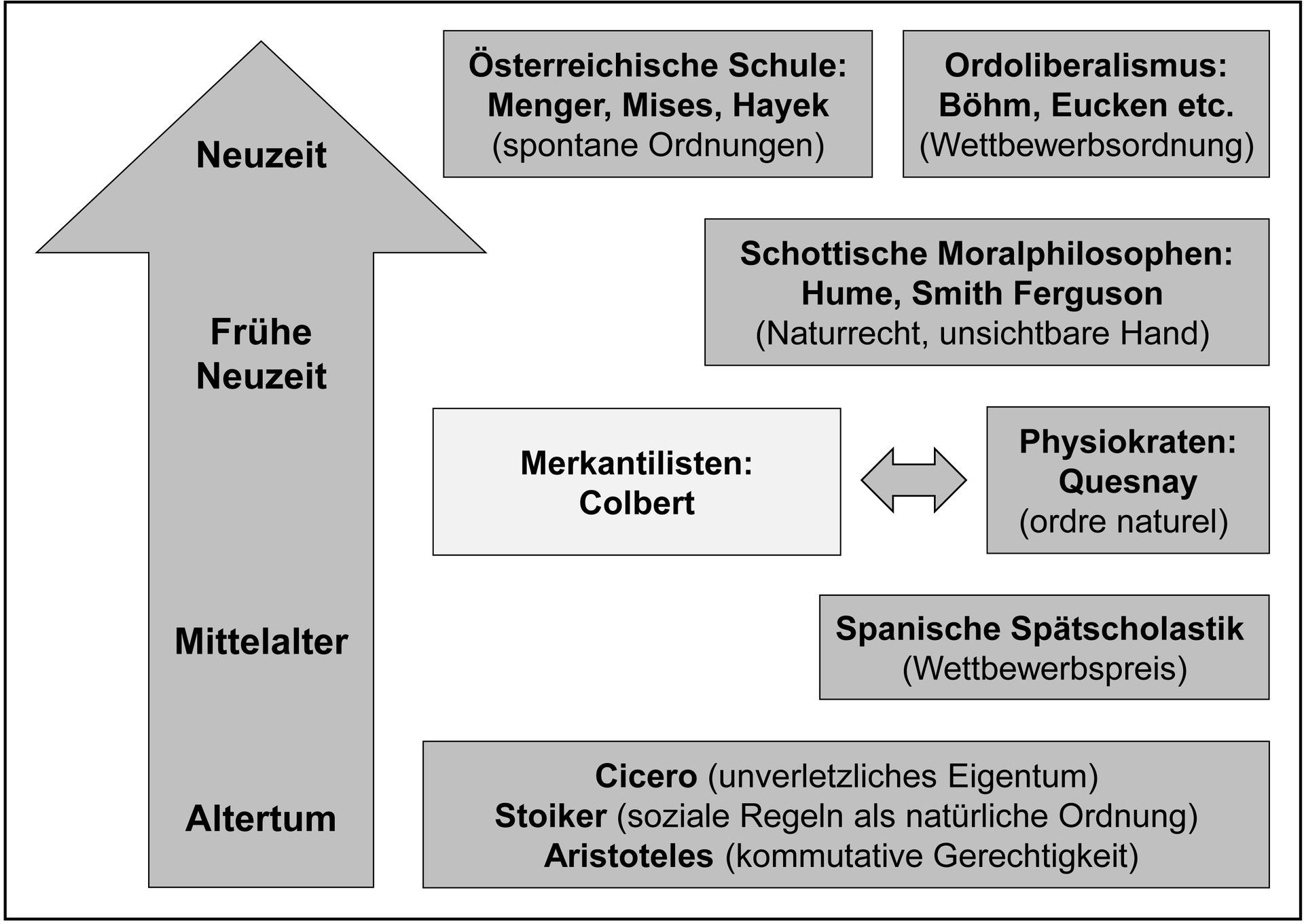 In Reaktion auf den cartesianischen Rationalismus entwickelten die schottischen Moralphilosophen des 18. Jahrhunderts (insbesondere David Hume, Adam Smith und Adam Ferguson) dann auf Basis der Theorien des „common law“ sowie des Naturrechts eine völlig neue Sozialtheorie. Sie machten deutlich, dass durch einen ständigen Prozess von Versuch und Irrtum in Verbindung mit zunehmender Arbeitsteilung ein komplexes, nicht geplantes Netz gegenseitigen Nutzens entsteht, in dem der Staat nur die vorgefundenen Regeln durchsetzen muss. Regeln entwickeln sich demnach aus den Handlungen der Individuen und verfestigen sich zu dauerhaften sozialen Institutionen, wenn sie die Probleme der Menschen erfolgreich zu lösen helfen. Die Marktwirtschaft beruht somit auf Regeln der Gerechtigkeit, die sich in einem langen evolutorischen Prozess ergeben haben.